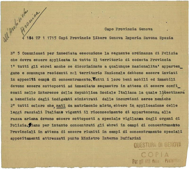 Nella primavera 1943 la presenza ebraica si accrebbe grazie all’arrivo di connazionali rimpatriati dalla Francia. Completata rapidamente l’occupazione militare della Provincia, le unità tedesche Gestapo e SS avevano visionato gli elenchi degli ebrei residenti. Ottenuta anche l’indispensabile collaborazione della polizia italiana, furono in grado di scatenare una lunga e spietata caccia all’ebreo già sperimentata altrove. La stagione del terrore ebbe inizio il 18 novembre 1943 a Bordighera con l’arresto dei tre membri della famiglia Hassan. Nella tragica notte tra il 25 e 26 novembre, uomini delle SS e agenti della polizia italiana operarono una grande retata. Vi incapparono trentacinque ebrei che furono arrestati a Ventimiglia, Bordighera e San Remo. Furono rinchiusi nelle carceri di San Remo ed Imperia e trasferiti successivamente a Genova.