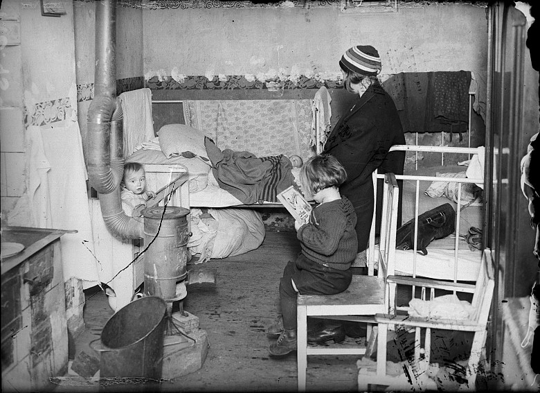 Le condizioni di partenza all’indomani della prima guerra mondiale per costruire l’esempio di un ‘contromondo socialista’ erano catastrofiche. L’ex capitale dell’impero crollato -un microcosmo multiculturale che rispecchiava la pluralità che lo componeva– era diventata la città più critica del continente, il popolo ridotto alla fame, al freddo in case malsane senza luce e acqua dove imperversava la tubercolosi, all’epoca chiamata appunto ‘malattia viennese’. Il 58% nelle famiglie operaie viennesi non disponeva di un proprio posto letto, un singolo letto veniva affittato e condiviso a turno dai cosidetti Bettgeher, i coricatori o coricaletto .