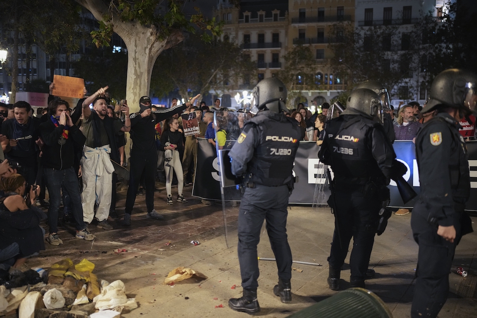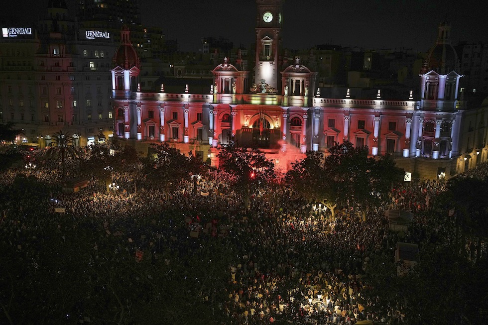 domenica 10 novembre 2024 — I manifestanti riuniti davanti al municipio di Valencia (AP Photo/Emilio Morenatti)